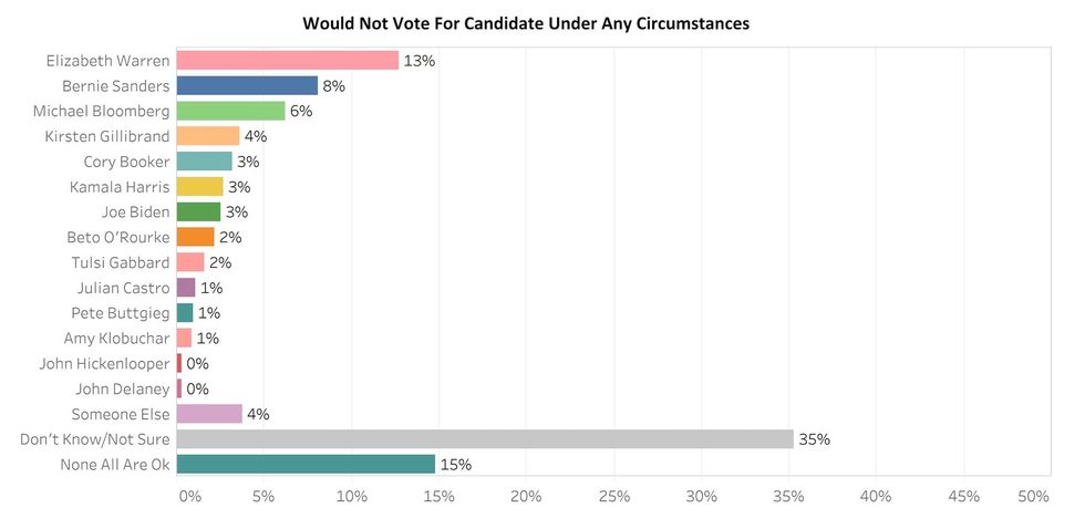 Sen. Warren received the most respondents, with 13 percent saying they would not support her under any circumstances.