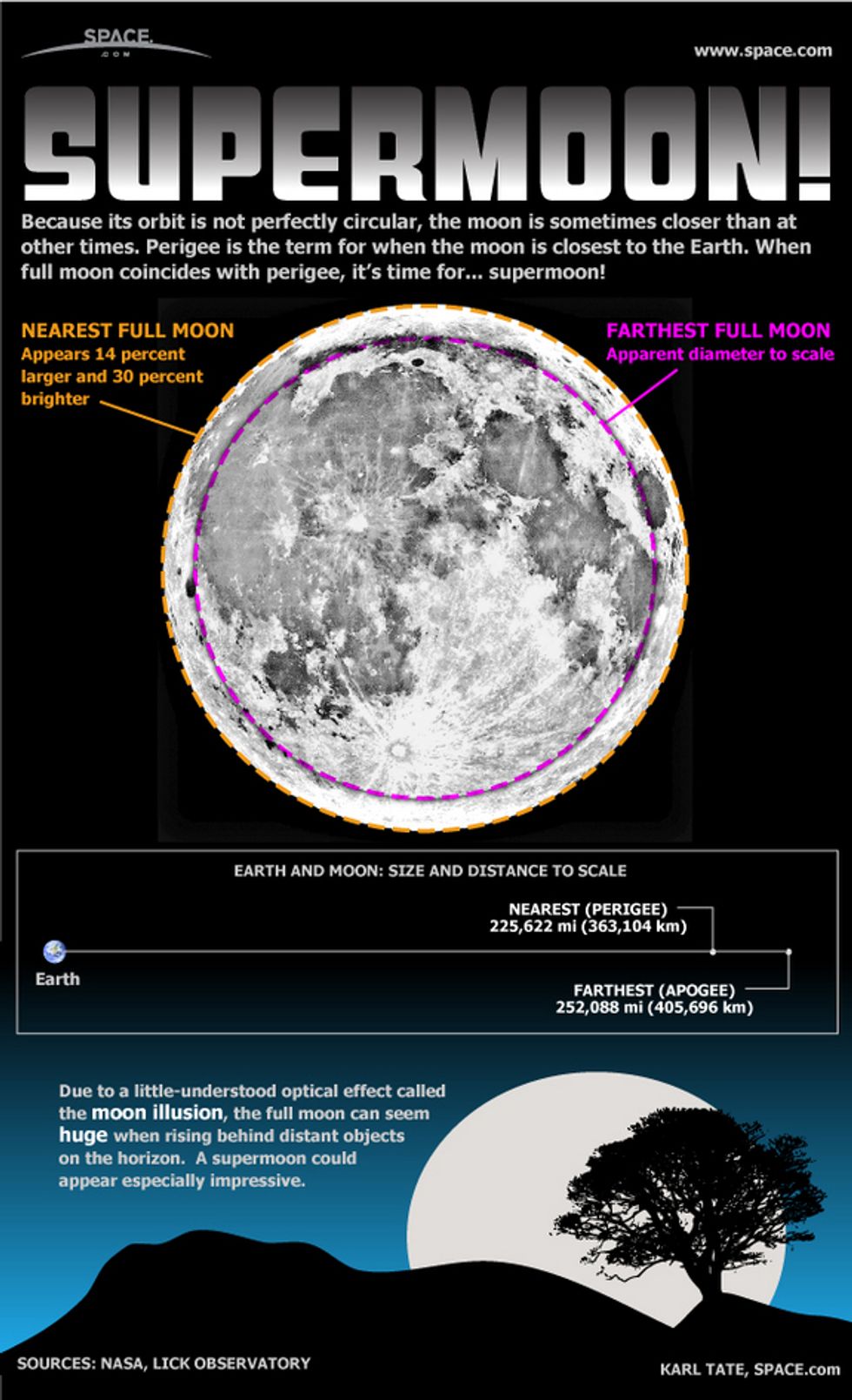 Saturday's event is a "supermoon," the closest and therefore the biggest and brightest full moon of the year. At 11:34 p.m., the moon will be about 221,802 miles from Earth. That's about 15,300 miles closer than average.