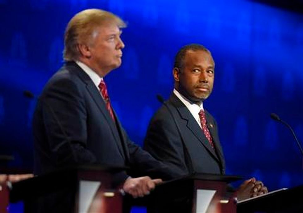 Ben Carson, right, watches Donald Trump during the CNBC Republican presidential debate at the University of Colorado, Wednesday, Oct. 28, 2015, in Boulder, Colo. (AP Photo/Mark J. Terrill)