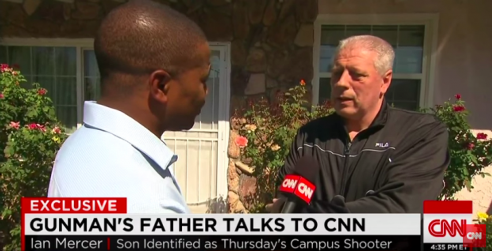 This dynamic was morbidly illustrated by the shooter's own father, Ian Mercer, over the weekend. In an interview on CNN, he launched into an unprompted diatribe about gun control laws. His son shot and killed nine people and the first thing he apparently thought to blame was lax gun regulation. It was disturbing and difficult to watch him as he desperately reached for the closest available rationalization. He's wrong, but I feel for him. He didn't send his son to execute a classroom full of innocent people. He didn't want this to happen. He isn't the murderer. And although his son is the villain in this scenario, he is still a father dealing with the loss of a child. I can't imagine the utter and complete emotional desolation he must be experiencing. To make matters worse, in the midst of his overwhelming sadness, guilt, anger and grief, he's been asked to offer a diagnosis of his killer son on national TV. He retreated to gun control talking points because he didn't want to face the real questions. And I suppose we shouldn't blame him for not wanting to face them with a camera and a microphone shoved in his grill.