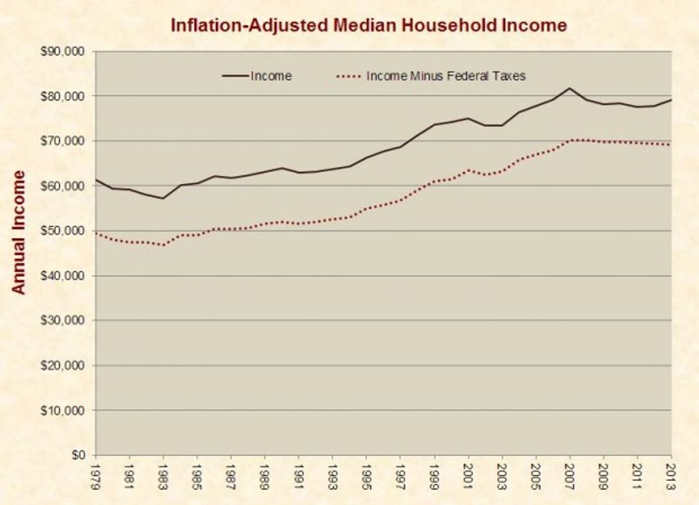 In June of 2016, CBO released a report that details inflation-adjusted household incomes over the past several decades. This data shows that median household income rose by $5,000 between 2000 and 2013 (the latest available data). This occurred in spite of the fact that household income has stagnated since the Great Recession of 2007–2009. These trends are even more vivid when subtracting out federal taxes in order to estimate take-home income: