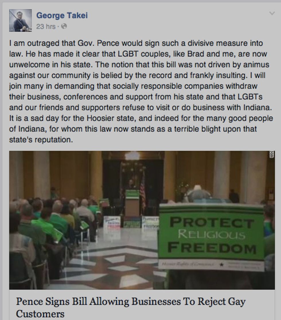 "Star Trek" actor George Takei isn't taking too kindly to Indiana Gov. Mike Pence's decision to sign into law a controversial bill aimed at upholding the religious freedom of business owners in the state.