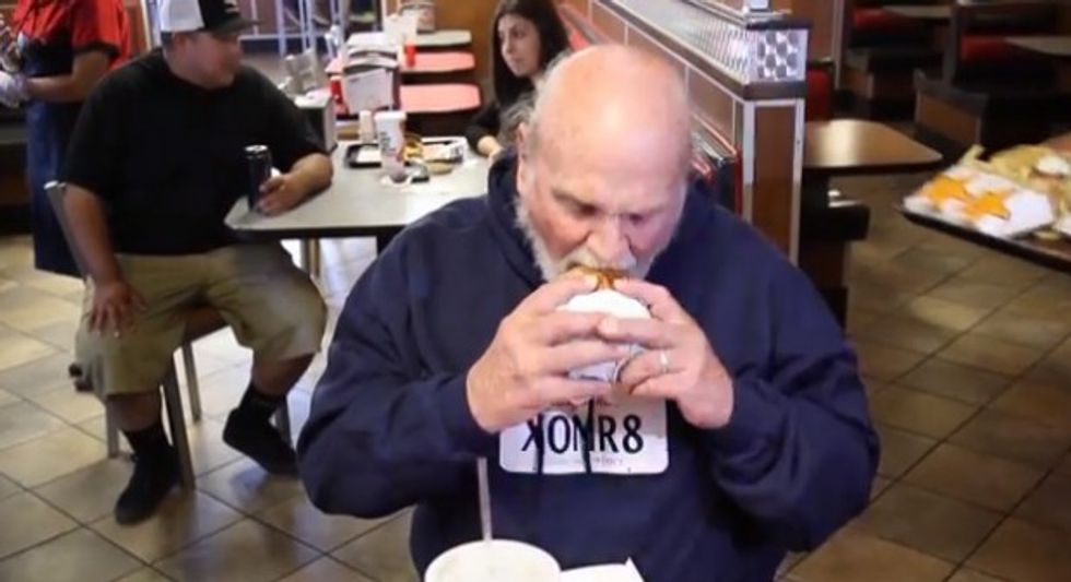 Hanline took his first bite of a hamburger after being freed from prison after serving 36 years for a crime he didn't commit. (Image source: YouTube)