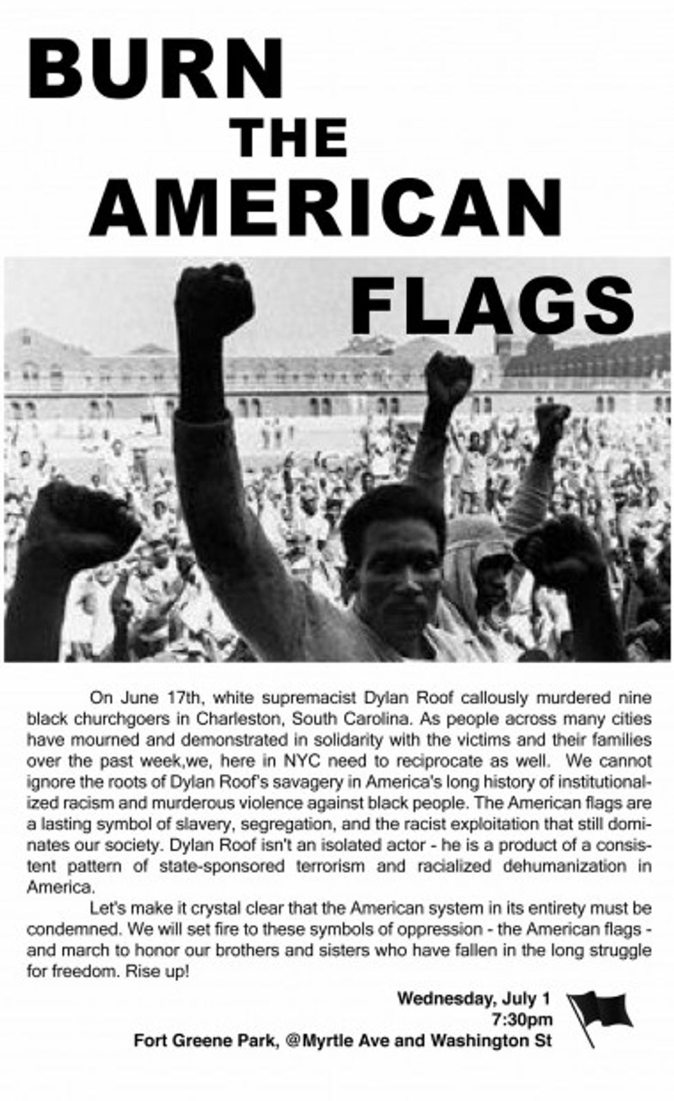 Organizers said accused Charleston shooter Dylann Roof wasn't an "isolated actor," but a "product of a consistent pattern of state-sponsored terrorism and radicalized dehumanization in America." The event originally was aimed at burning the Confederate flag, but later changed to focus on the stars and stripes.