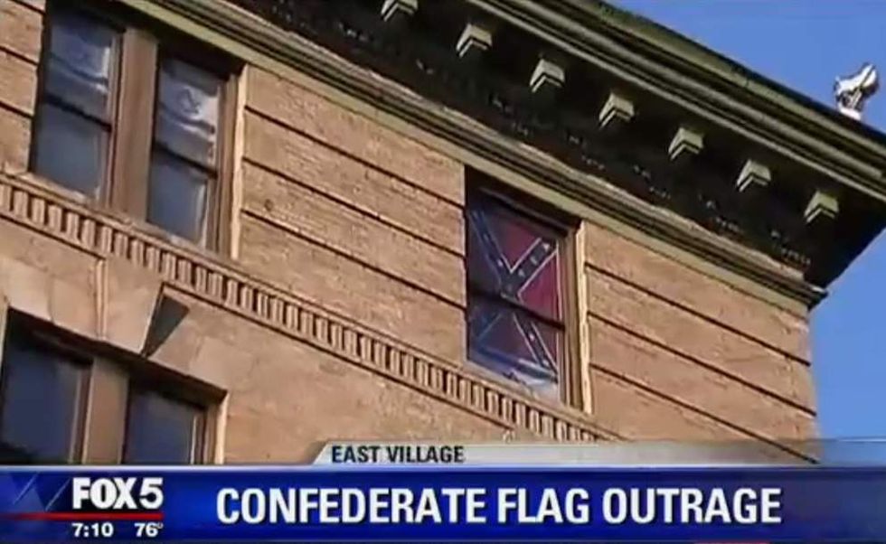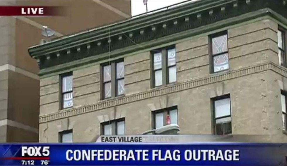 In related news, residents of an East Village neighborhood in New York City are outraged that a fifth-floor apartment is displaying Confederate flags in a window — which actually elicited a protest in front of the building.