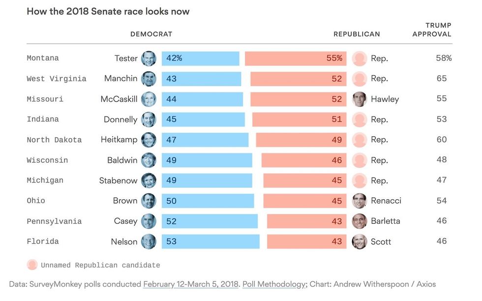 The Axios poll in conjunction with SurveyMonkey found that there were 10 Senate seats that Democrats were defending in the midterms in states where Trump won in the 2016 election. In six of those states, his approval rating is above 50%, another warning sign that the seats might flip to the Republican side.