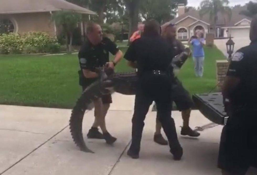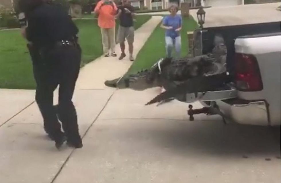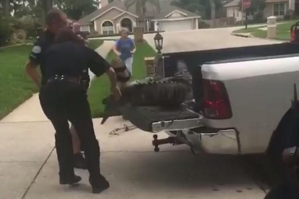 But after it was tied up, and the wildlife trapper — along with two police officers — hoisted it into the back of a pickup, the gator put on a lightning-fast display of power for all the humans.