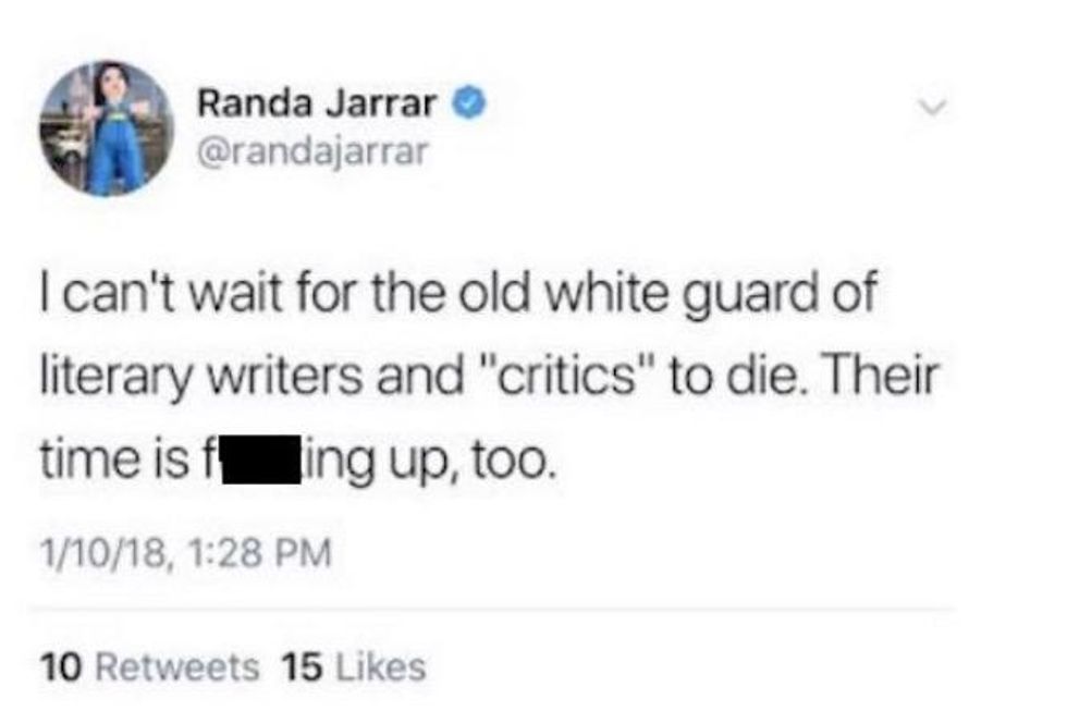 Jarrar posted a similar tweet about whites in literary circles earlier this year, the Daily Wire said: “I can’t wait for the old white guard of literary writers and ‘critics’ to die. Their time is f***ing up, too."