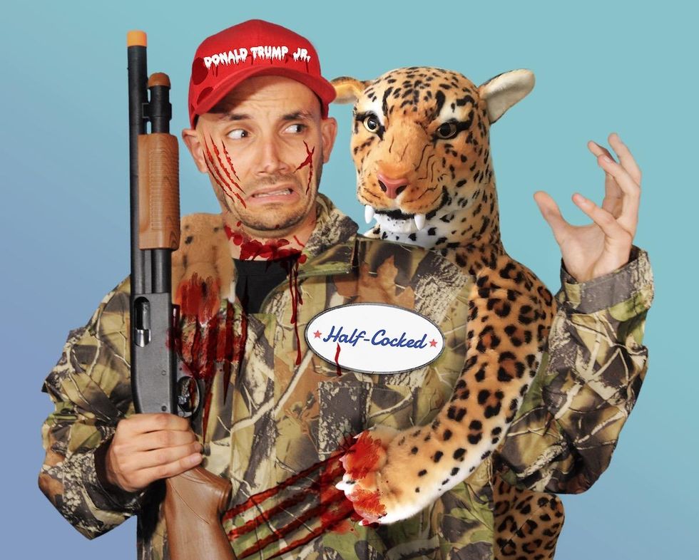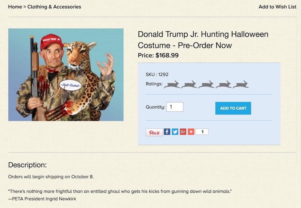 "This limited-edition Donald Trump Jr. Halloween costume was inspired by and is a twist on the trophy-hunting photo that showed the Trump brothers grinning over the body of a dead leopard," read the website.