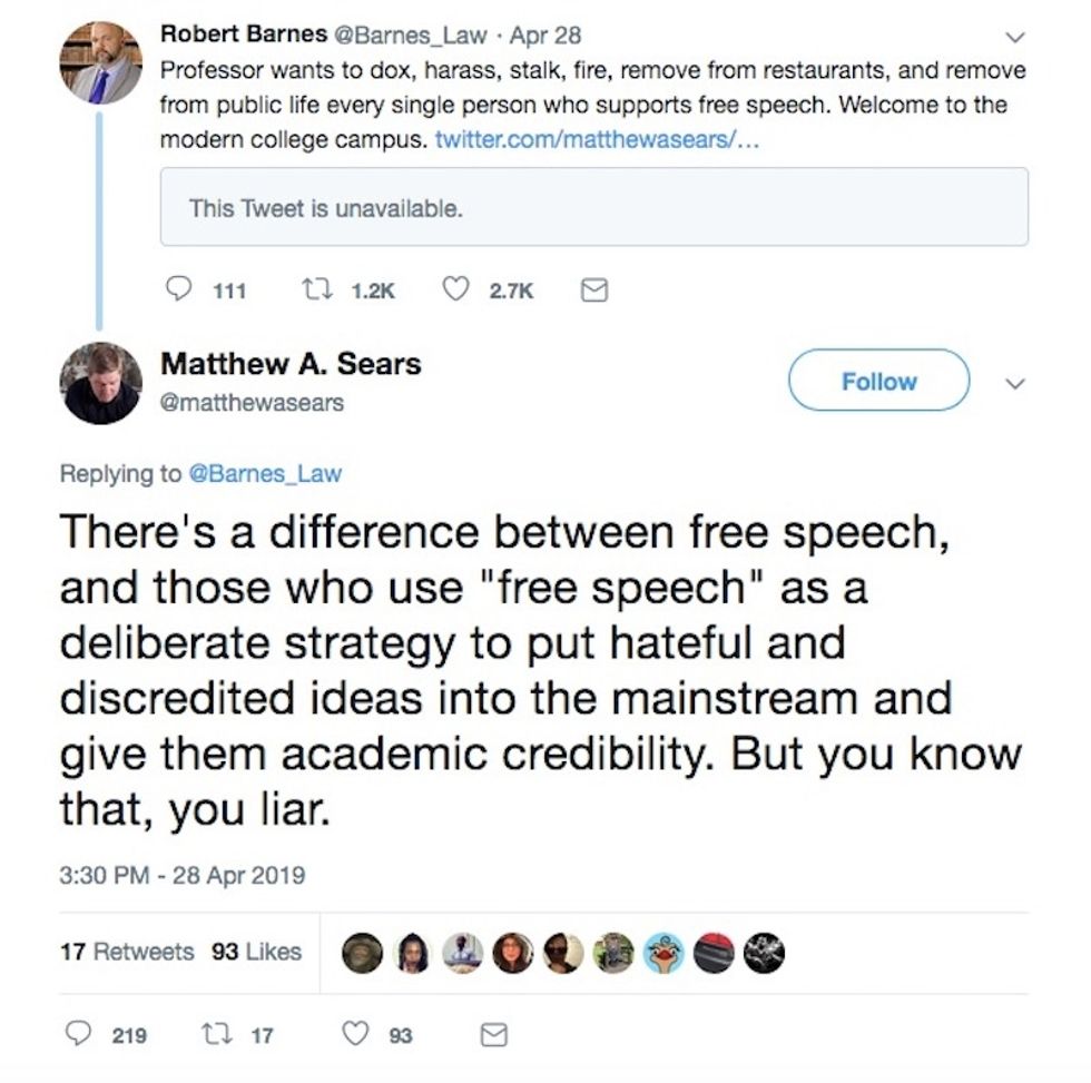 Trial lawyer Robert Barnes pushed back against Sears' second tweet attacking college student free-speech advocates, and Sears replied that "there's a difference between free speech and those who use 'free speech' as a deliberate strategy to put hateful and discredited ideas into the mainstream and give them academic credibility. But you know that, you liar."