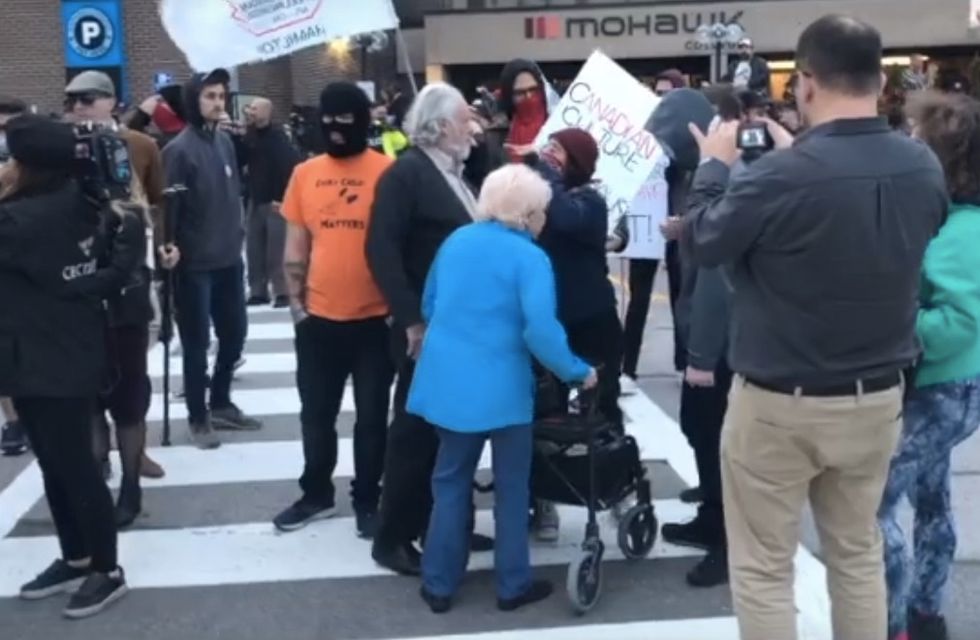 Masked left-wing protesters, identified as Antifa, were caught on video screaming at a white-haired elderly woman with a walker, "Off our streets Nazi scum! Off our streets Nazi scum!" outside a conservative event at a Canadian college Sunday evening.