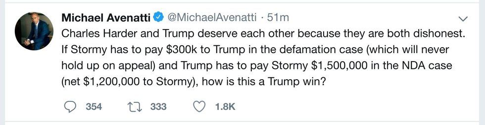 "[Trump's personal attorney,] Charles Harder and Trump deserve each other because they are both dishonest," he added in a second tweet.