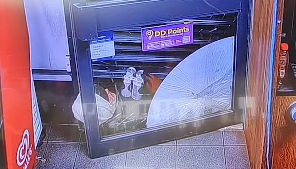 Although Trimble finally got the door open, his escape was anything but assured. He dropped his beer on the threshold, then attempted what police later referred to as an "Indiana Jones-style slide" under the closing shutters. His feet, legs and lower torso made it outside, but the thief's upper half was left behind along with the beer.