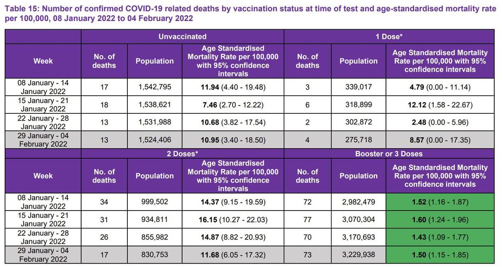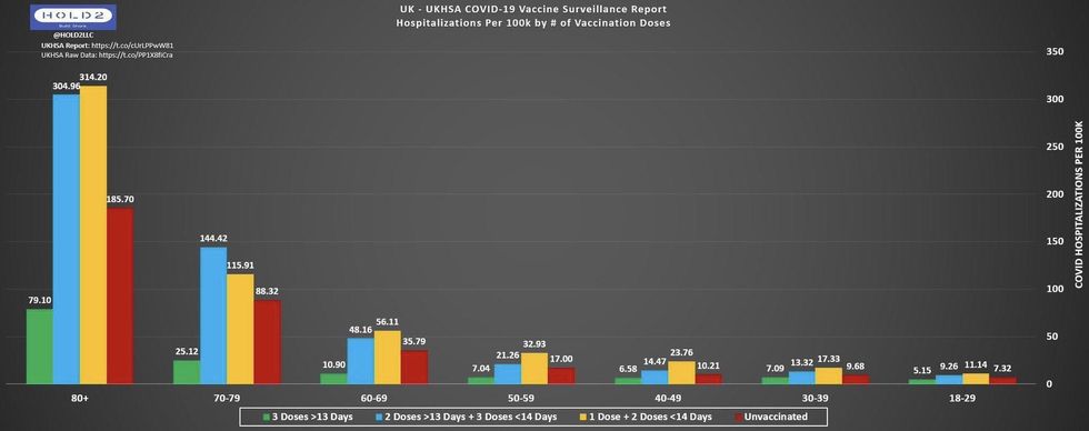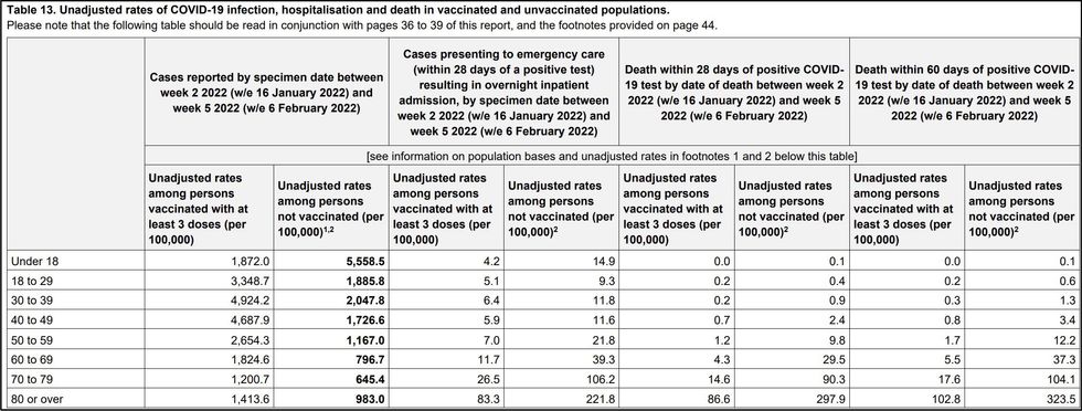 In this UKHSA table, you can see how every vaccinated adult age group has higher case rates than unvaccinated adults of the same age, and this is comparing against people with three doses, not just two.