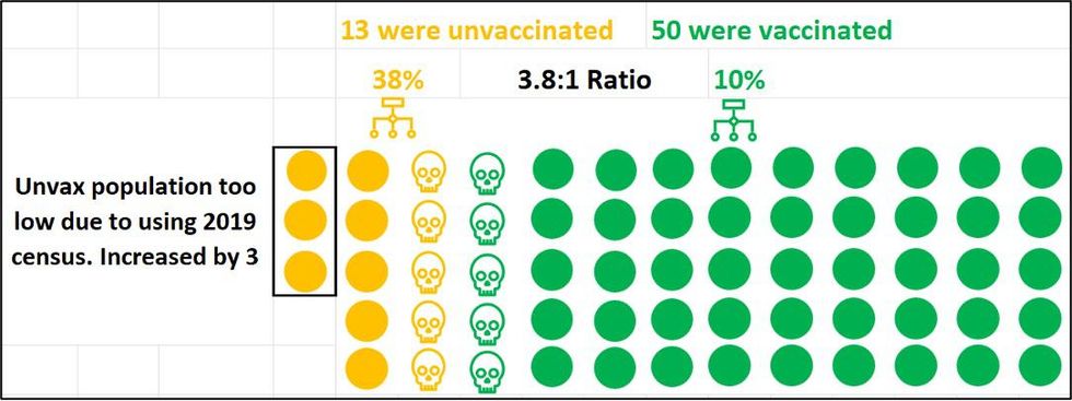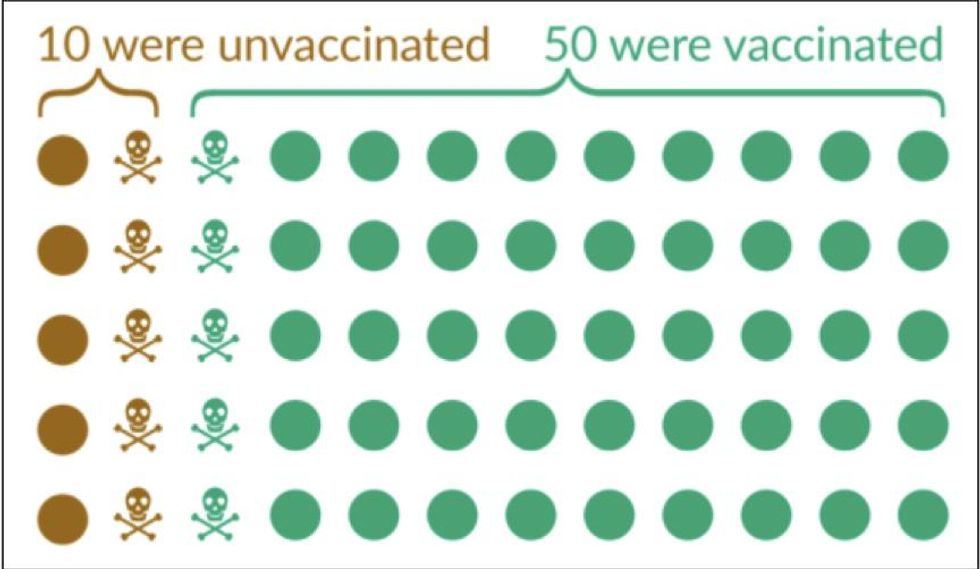 In the figure above, which illustrates a hypothetical scenario, you see 10 total deaths split evenly among unvaccinated and vaccinated, but there are only 10 total unvaccinated people with 50 total vaccinated people. The result of this is a 5:1 death ratio for unvaccinated compared to vaccinated.