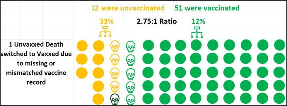 But in addition, we also must calculate the effect of what happens when additional vaccine record matching occurs and finds that one of the five unvaccinated deaths was a vaccinated person.