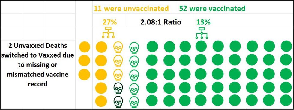In this hypothetical, this now reduces the death ratio from 3.8:1 to 2.75:1 for unvaccinated. If we match one more vaccine record, the ratio drops even further, to 2.08:1..