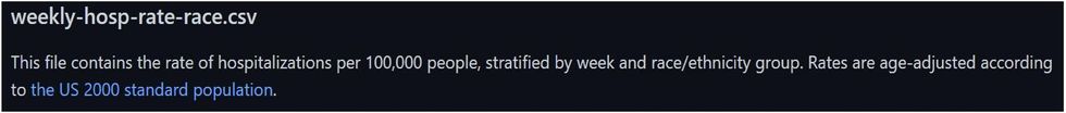 Take note of the description at the top of the graph, “Hospitalizations per 100,000 people (age-adjusted, for week ending on listed date).” From this, it is clear that there are at least two mathematical issues to uncover: 1) What population is being used for the “per 100K” calculation, and 2) How the age-adjustment is being done.