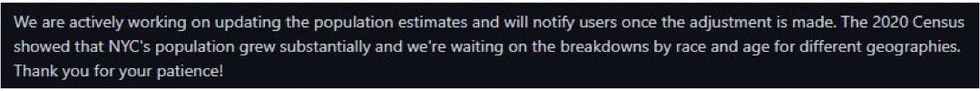 However, this number is much lower than NYC’s current population, which is estimated to be 8.85 million. The official 2020 Census shows 8.80 million, which would at least be a more reasonable population to use than 8.34 million. NYC Health acknowledged this in communication with the author but chose not to update key rate metrics due to not yet having all the granular demographic breakdowns:
