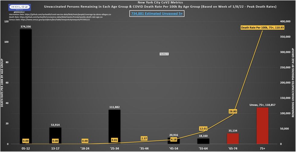 This is a standard, appropriate step to take when the comparison cohorts have substantially different age distributions. This is what you would expect when comparing unvaccinated with vaccinated, but which weighting is NYC Health applying to its data? NYC has an unusual age distribution for the unvaccinated cohort, which skews heavily toward 65+ among adults. For example, the figure below demonstrates the age distribution of unvaccinated persons in NYC overlaid with the COVID death rate for the same age groups as of the week of Jan. 8, 2022 (peak deaths for NYC).