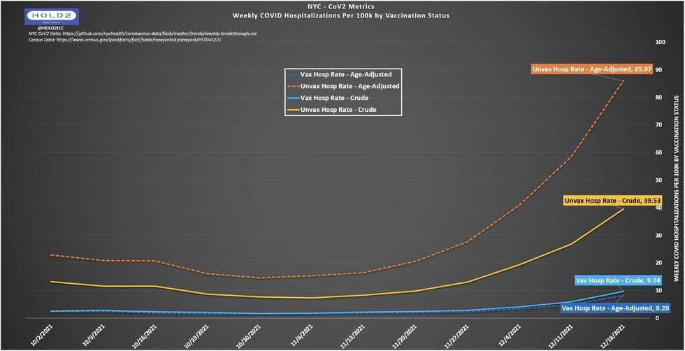 When I first looked at the NYC Health COVID-19 Data site, I immediately noticed the dramatic difference between unvaccinated (97.46) and vaccinated (3.00) hospitalization rates, which is ~32.5:1 (Fig. 7). Besides this large differential appearing implausible, I also noticed the vaccinated line appeared to peak the week before (12/12), while unvaccinated was still skyrocketing. This did not make sense at all, which enticed me to explore how these rates were derived.
