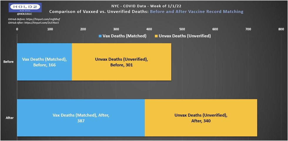 The shift from unvaccinated to vaccinated in NYC Department of Health’s data was not limited to the week of Dec. 18, 2021. Consider the data regarding COVID-19 deaths from the week of Jan. 1, 2022.