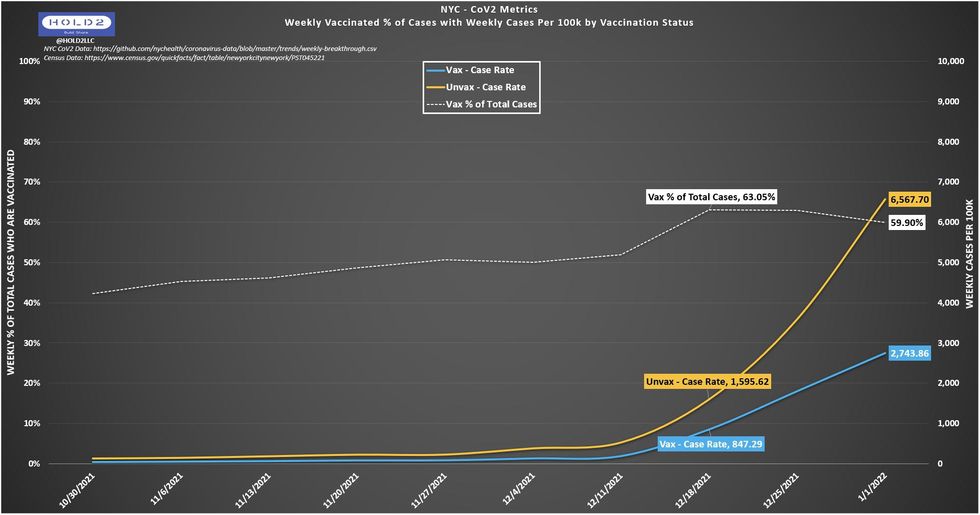 But when you look at my chart below, you can clearly see how the VRM pattern is incomplete for the weeks of Jan. 8 and Jan. 15, where there is currently an artificial dip that corresponds with the inverse mountain on the NYC chart. As you can probably guess by now, the artificial dip in my chart will fill in, and the artificial spike on the NYC chart will lessen, along with a corresponding increase on the orange vaccinated line.
