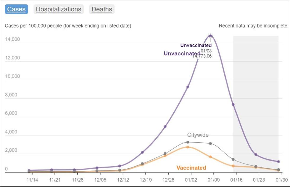 Given that elderly were the first population to receive access to the vaccine and that vaccinating the elderly has been the highest priority of virtually all public health agencies, seeing these startling distributions calls any age adjustment being used by New York City into question. Unfortunately, the NYC Department of Health does not publish COVID outcomes by age vaccination status, so we don’t know how the much higher death rate for individuals over the age of 75 is adjusted for in NYC’s rates.