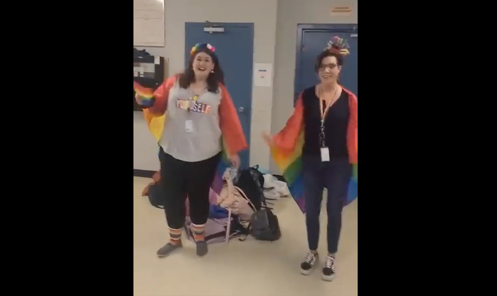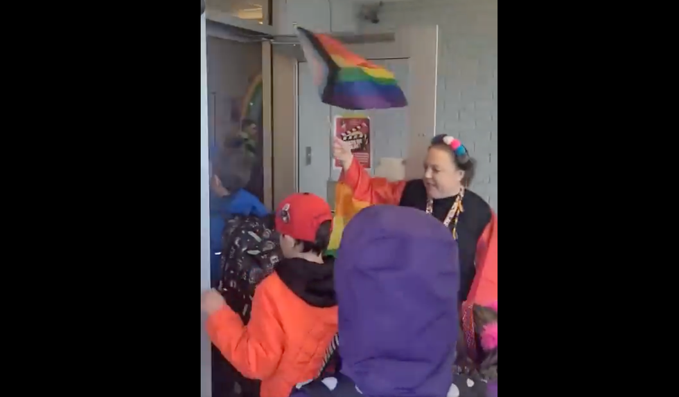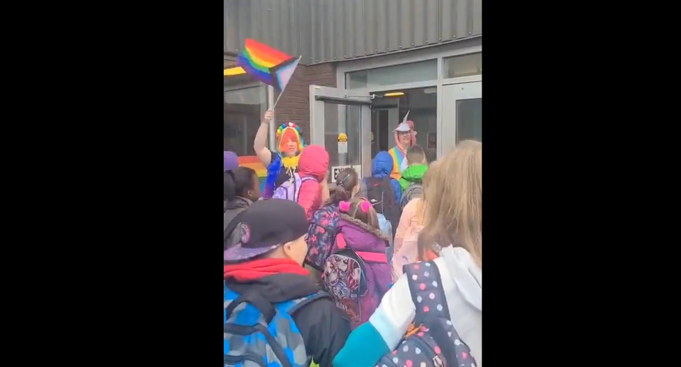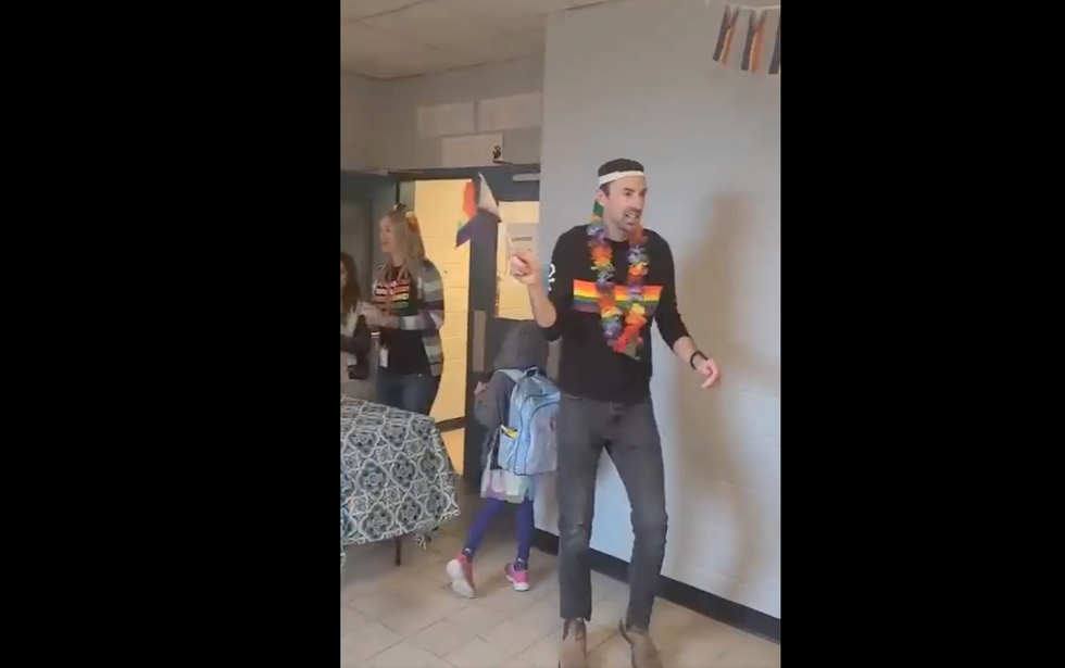 Yet another video that's been reposted numerous times on social media appears to show students arriving at the school in the morning as teachers — dressed to the hilt in rainbow colors and waving rainbow flags — greet them every few feet.