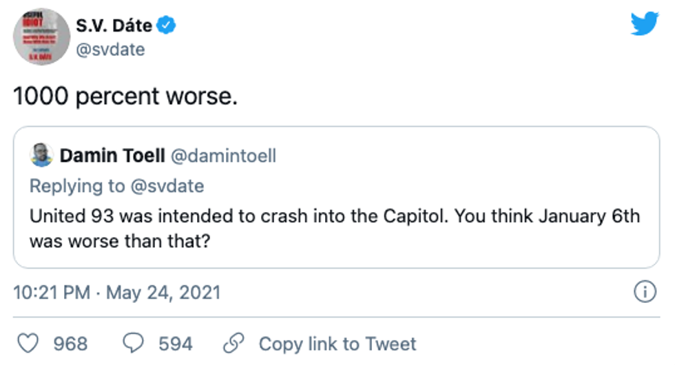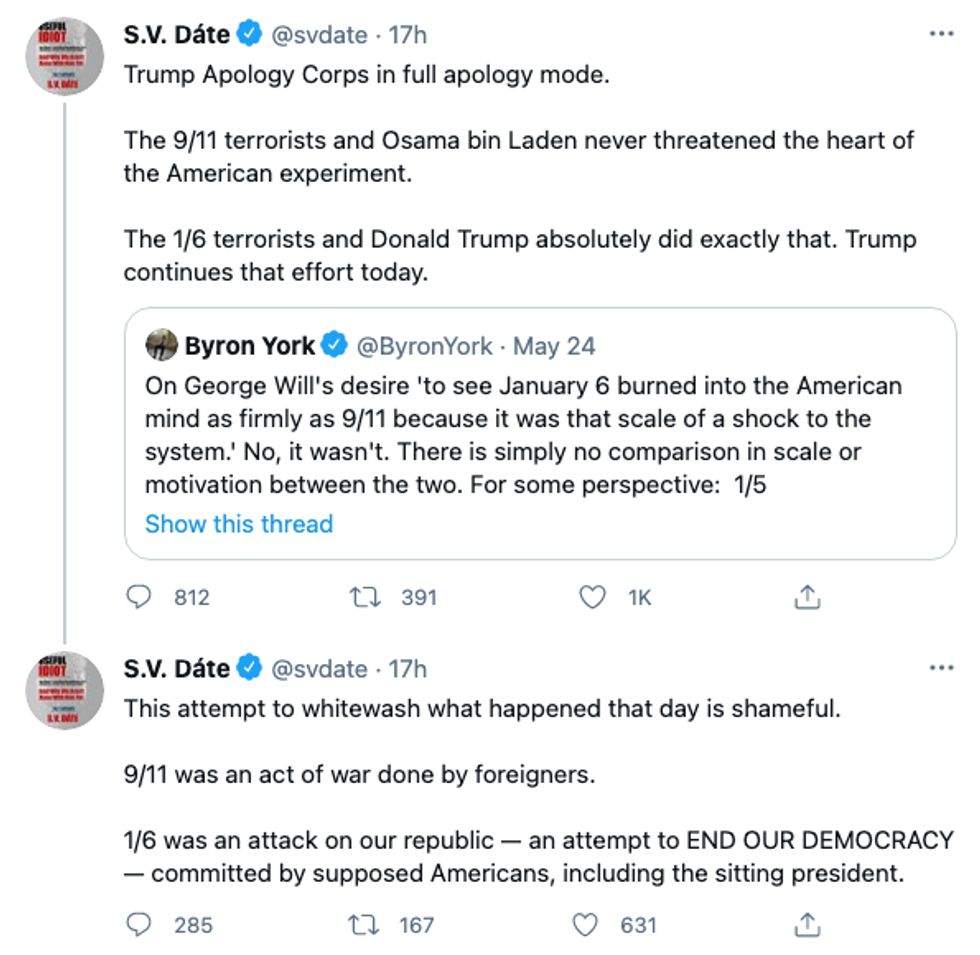 "This attempt to whitewash what happened that day is shameful," Dáte continued, noting that while Sept. 11 was an "act of war," Jan. 6 was an "attempt to END OUR DEMOCRACY" carried out by U.S. citizens, including then-President Donald Trump.