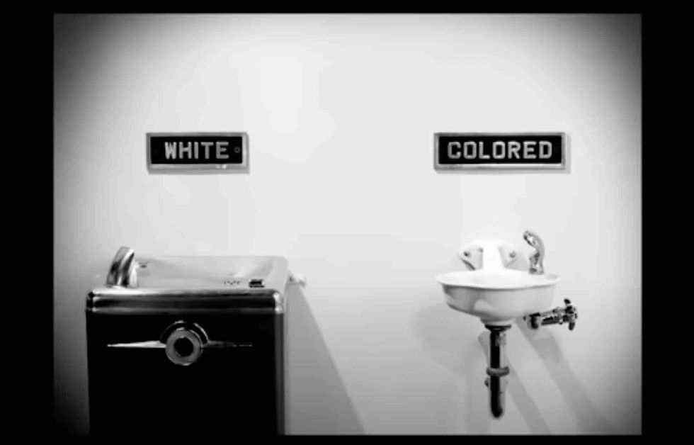 It includes images such as a noose swinging over a black man, separate water fountains for "white" people and "colored" people, and a man in a wheelchair rolling over and crushing a Trump mask.