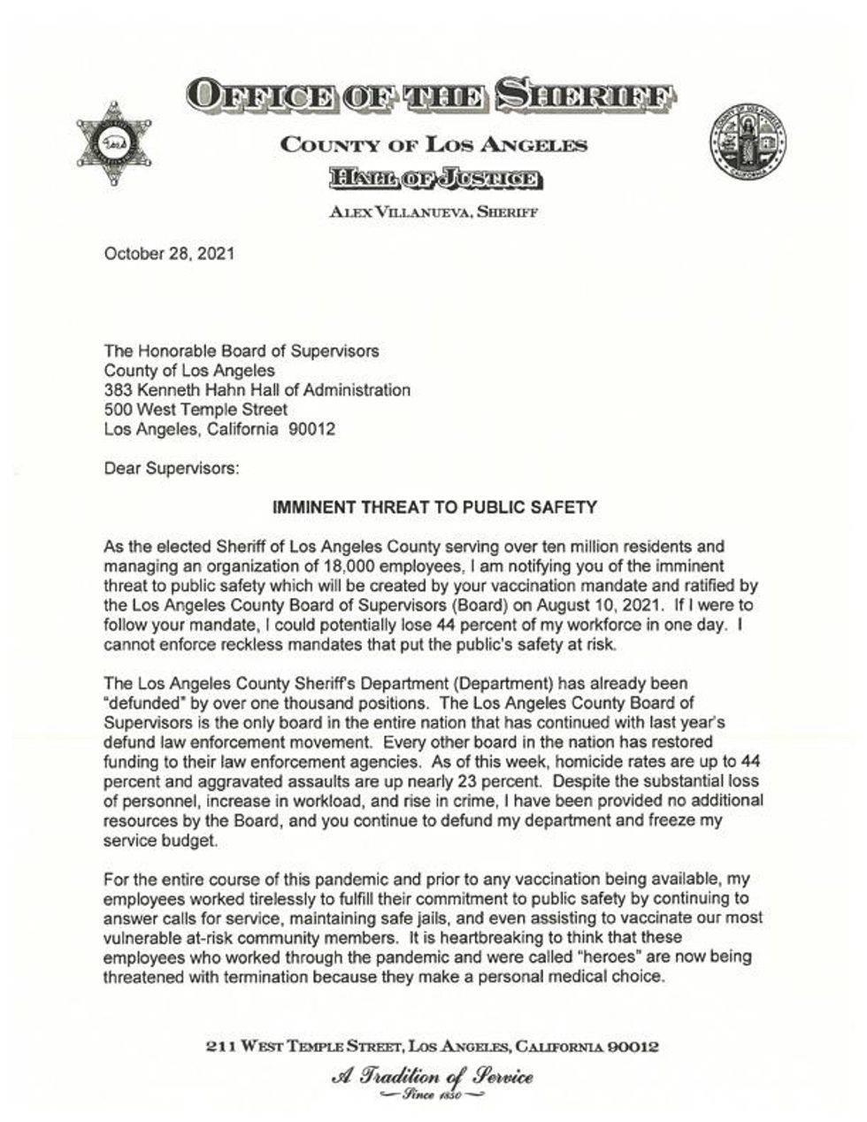 In a note to the public posted to his website Thursday, Sheriff Villanueva warned that the vaccination mandate has created a "mass exodus."