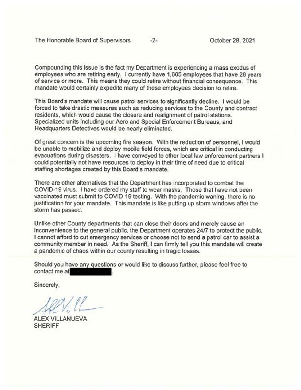 According to Villanueva, 20% to 30% of his workforce will no longer be available if the county sticks to its get-jabbed-or-hit-the-bricks policy — and it's something he warned county officials about long ago.