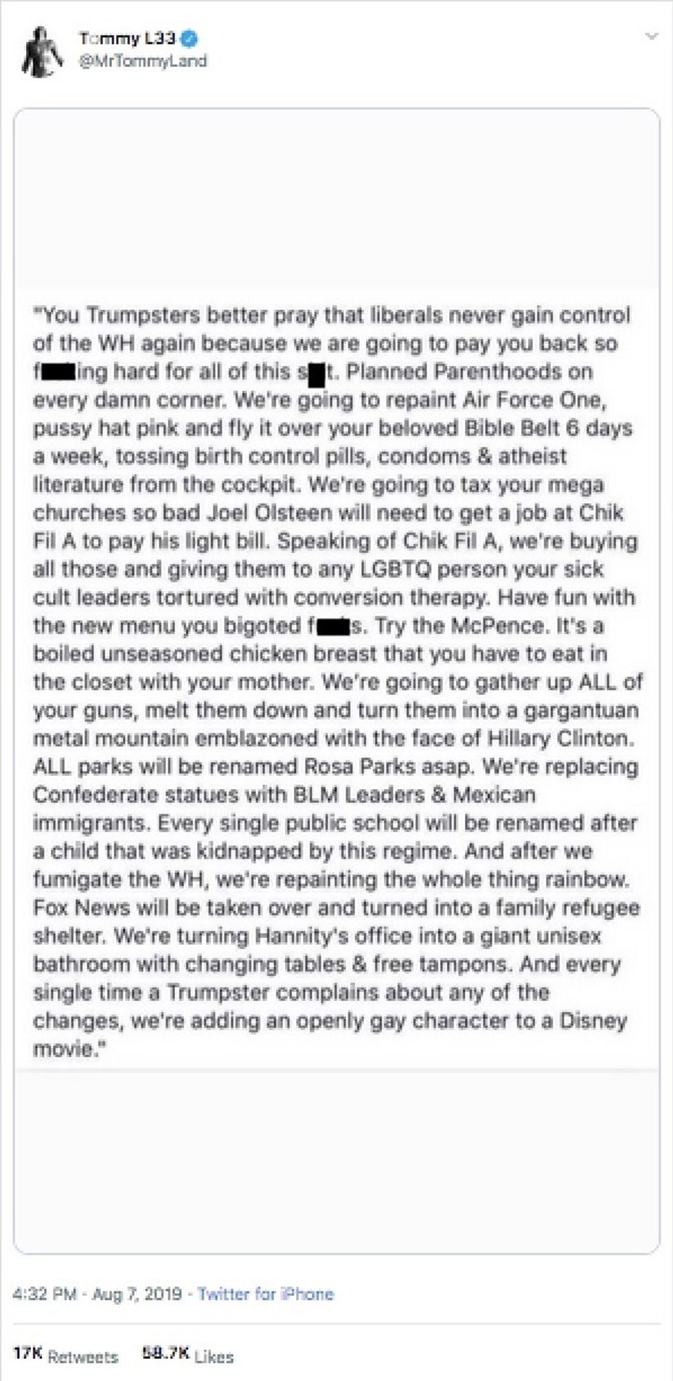 Who knew Tommy Lee — bad-boy metal drummer of Motley Crue fame — has such a way with words when it comes to blasting supporters of President Donald Trump?
