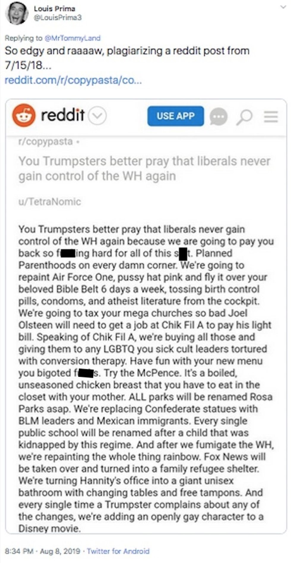 The diatribe also promises "Planned Parenthoods on every damn corner. We're going to repaint Air Force One pussy hat pink and fly it over your beloved Bible Belt 6 days a week, tossing birth control pills, condoms & atheist literature from the cockpit."