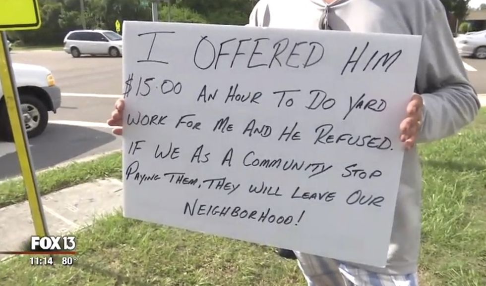 Meaning Bray — who works for Bray Remodeling, his family's business — offered the panhandler work for money as opposed to a handout: $15 an hour to do yard work, WTVT said.