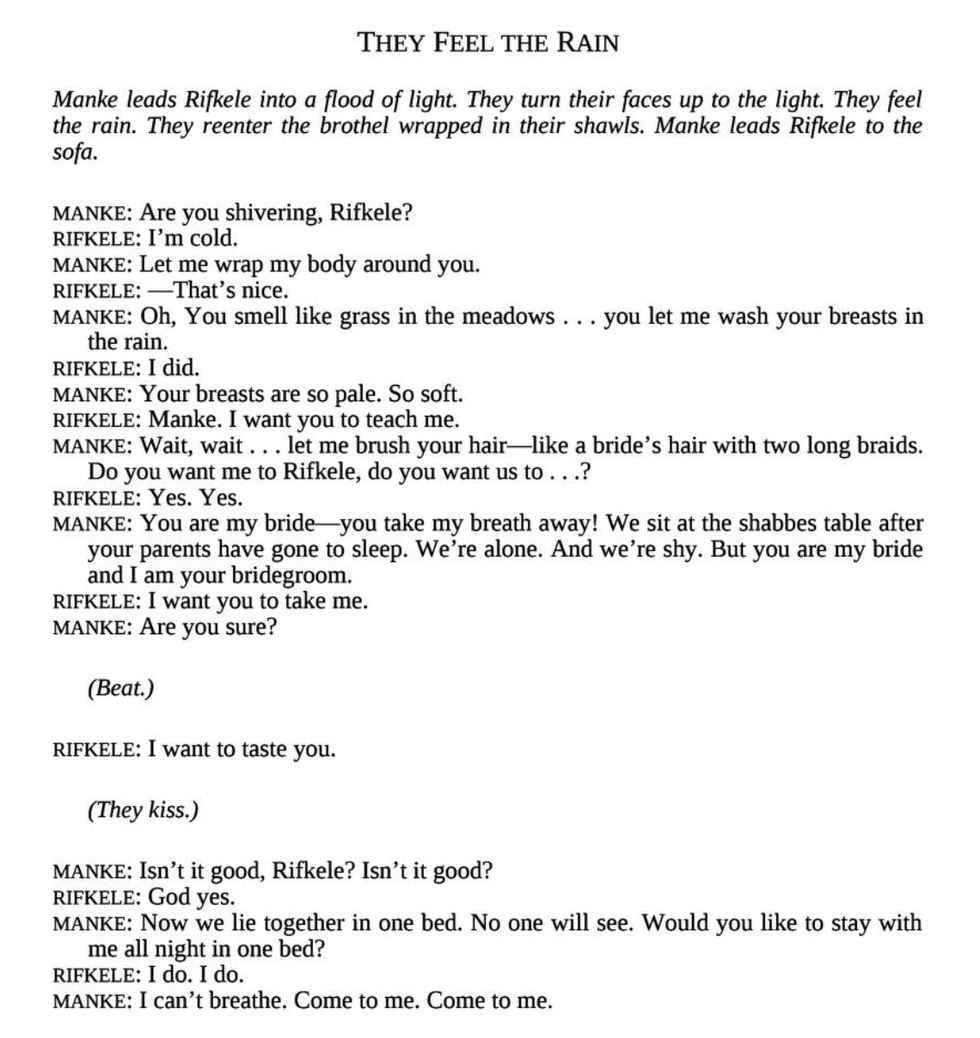 A scene from the play involves two women standing in the rain before retreating into a brothel and then getting into a bed: