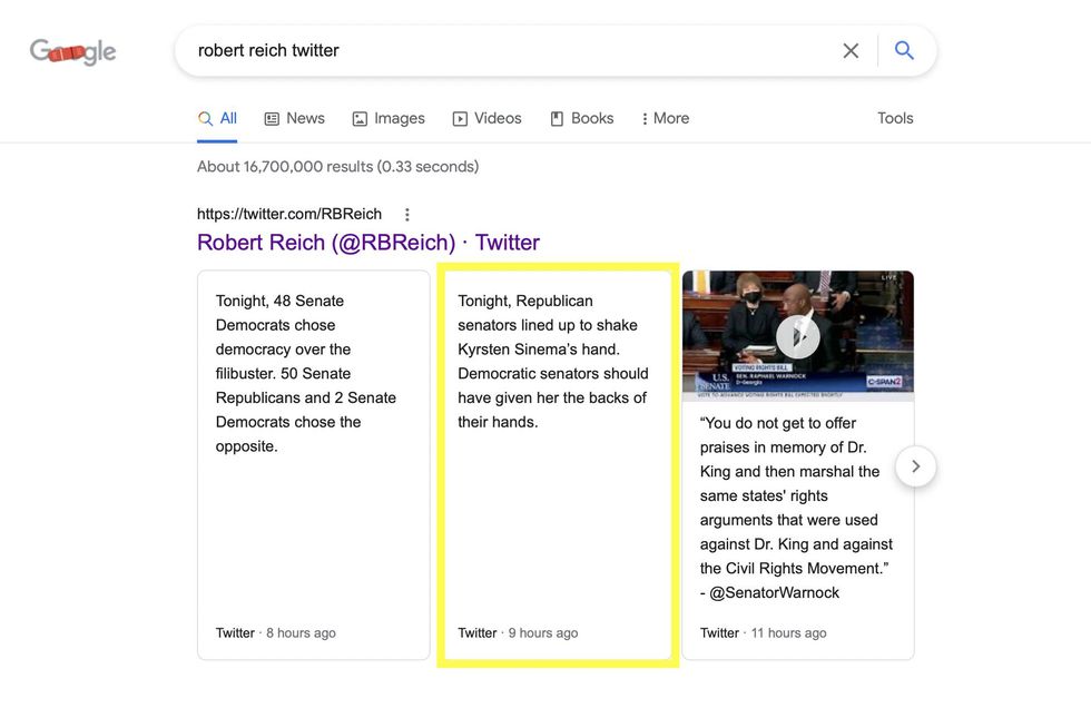 A Google search Thursday morning for "robert reich twitter" showed the tweet in the search results: