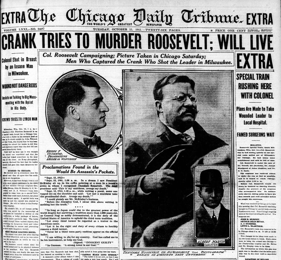 Schrank — who later told police he had a vision of McKinley’s ghost, who said he blamed Roosevelt for his murder and wanted Schrank to shoot him — had been following Roosevelt across eight states, looking for his opportunity.