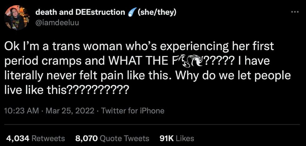 The user tweeted, "Ok I'm a trans woman who's experiencing her first period cramps and WHAT THE F***????? I have literally never felt pain like this. Why do we let people live like this??????????"