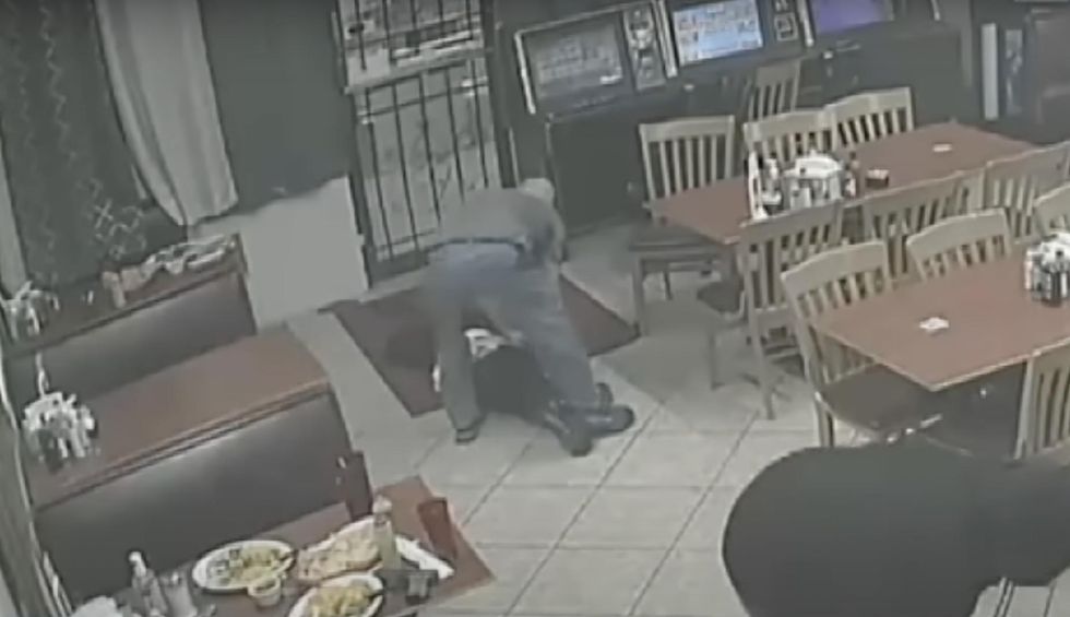 Finally, the customer walked to the door, dumped a beverage on the robber lying on the floor, and walked out.