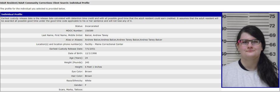 The Maine Department of Corrections lists Andrew Balcer, a biological male looming at over six feet tall and weighing in at over 245 pounds, as a "female" with the alias "Andrea Balcer."