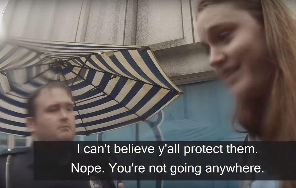 But the officer cut in front of her and prevented her from leaving: "Nope. You're not going anywhere. Right now you're being detained, okay?"