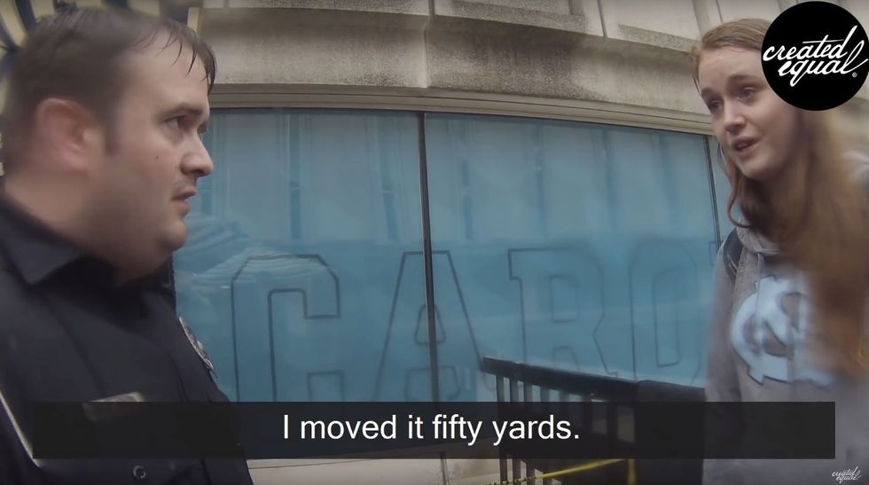 After being forced to give back the activist's sign, the student tried to leave the scene, saying "I can't believe y'all protect them."