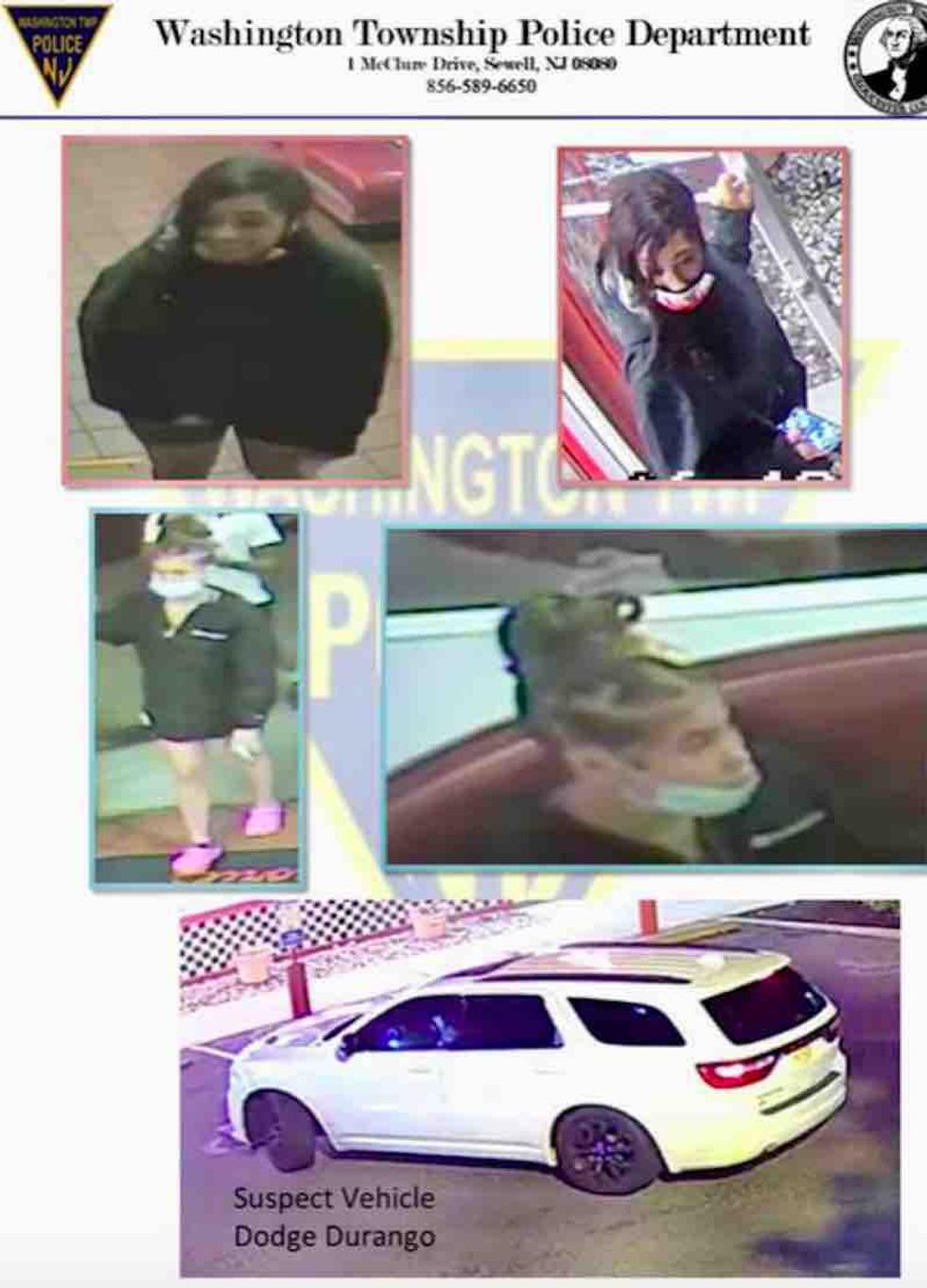 Washington Township police said five suspects attempted to leave a Nifty Fifty's restaurant without paying at about 11:15 p.m., and a waitress tried to stop them — only to be pulled inside a white Dodge Durango and assaulted as the vehicle drove off.