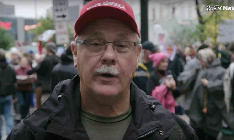 Dave Carlson, a salesman, was telling VICE News on camera why he donates to Trump's campaign when a protester spit on Carlson's face and kept walking by.