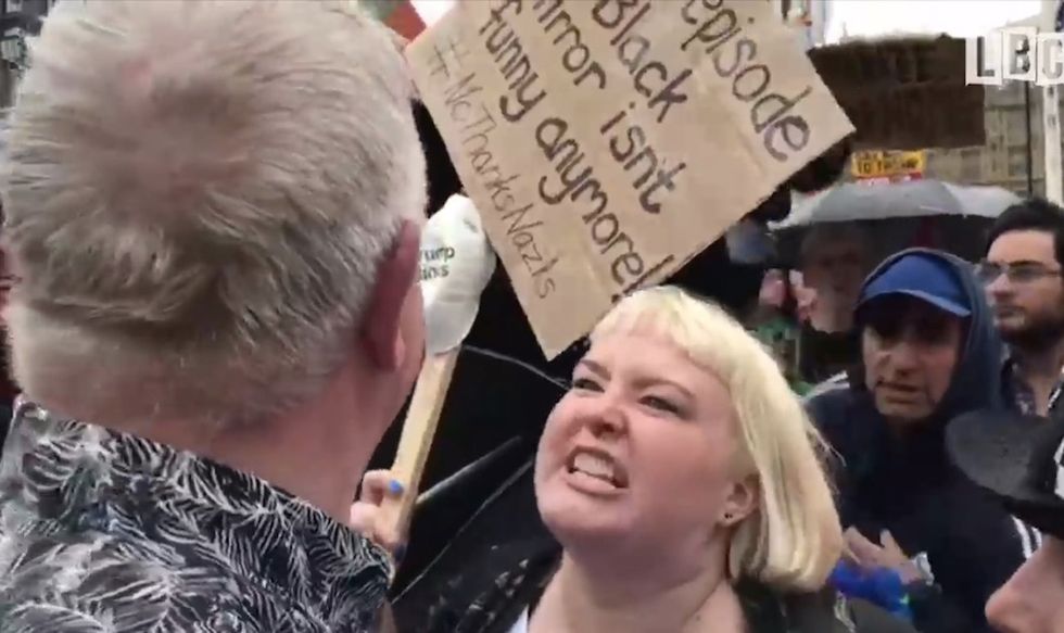 A leftist woman who repeatedly screamed "Nazi scum!" at a supporter of President Donald Trump earlier this week amid protests over Trump's state visit to the United Kingdom bolted from a job connected to Great Britain's National Health Service and deleted all her social media accounts after backlash against her, the Daily Mail reported.
