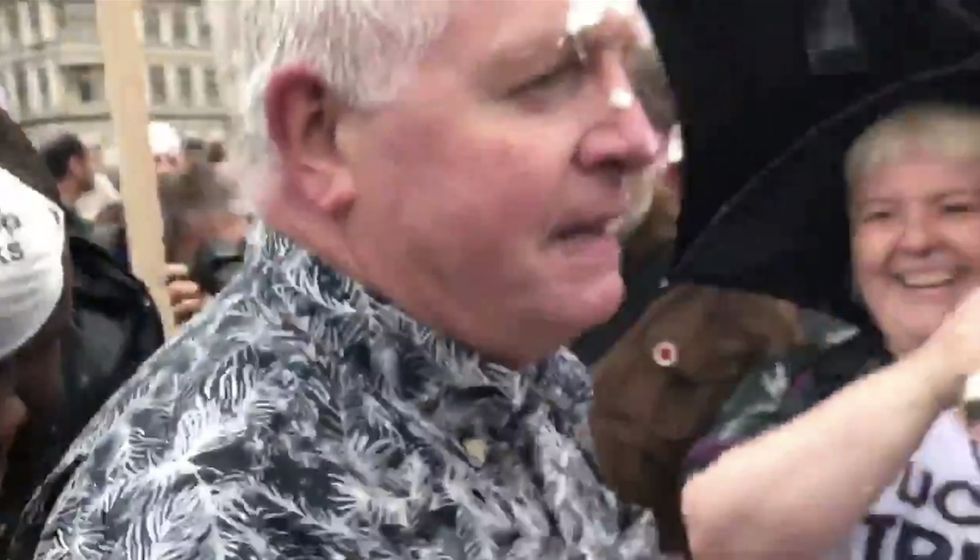 The Trump supporter also told the Daily Mail that protesters kicked him in the legs, attacked him with a banner, and went after his MAGA hat. The video description indicated he said things turned violent because protesters "couldn't answer" questions he was asking them.