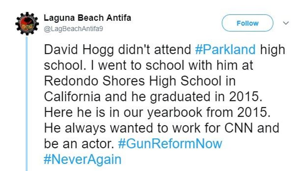 Most recently, Parkland High School shooting survivor-turned-gun-control activist, David Hogg, was accused of being a crisis actor by Twitter user, Laguna Beach Antifa.