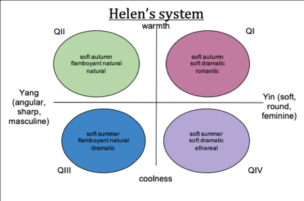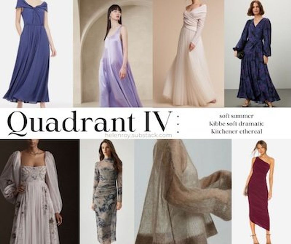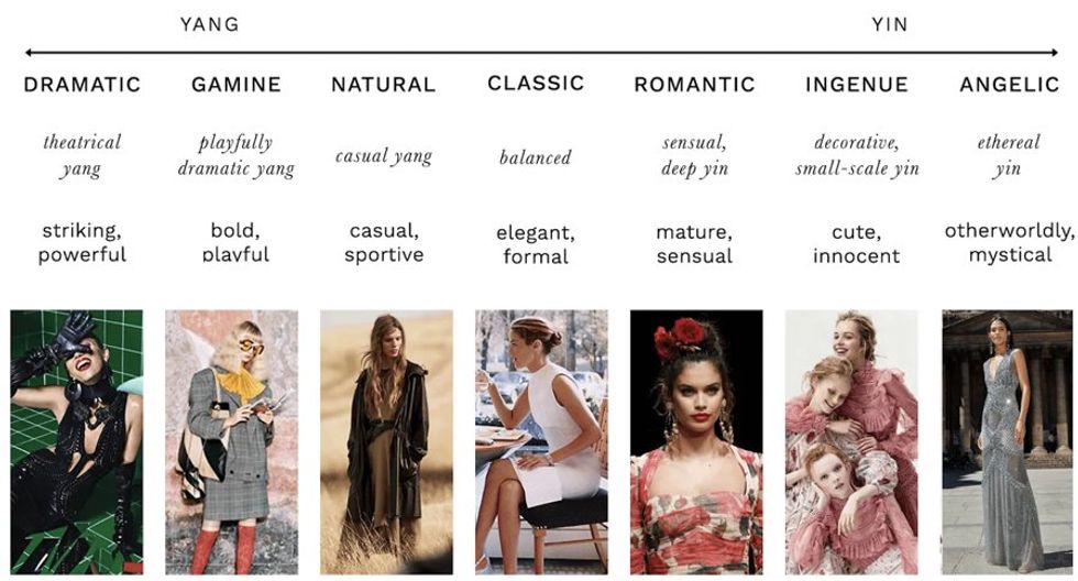 The Kitchener system accounts for these kinds of particularities; she might be a Kibbe “dramatic” type but with a Kitchener “ethereal” essence — bodily yang, but essential yin. She therefore looks better in this kind of delicate and celestial fabric than other Kibbe “dramatics.” Most people, because most people are a confounding combination of yin and yang, cool and warm, and various personality traits, can see themselves in at least three of his archetypes, depending. Note: Though Kibbe and Kitchener use some of the same words, a Kibbe “gamine” is very much not the same as a Kitchener “gamine.”